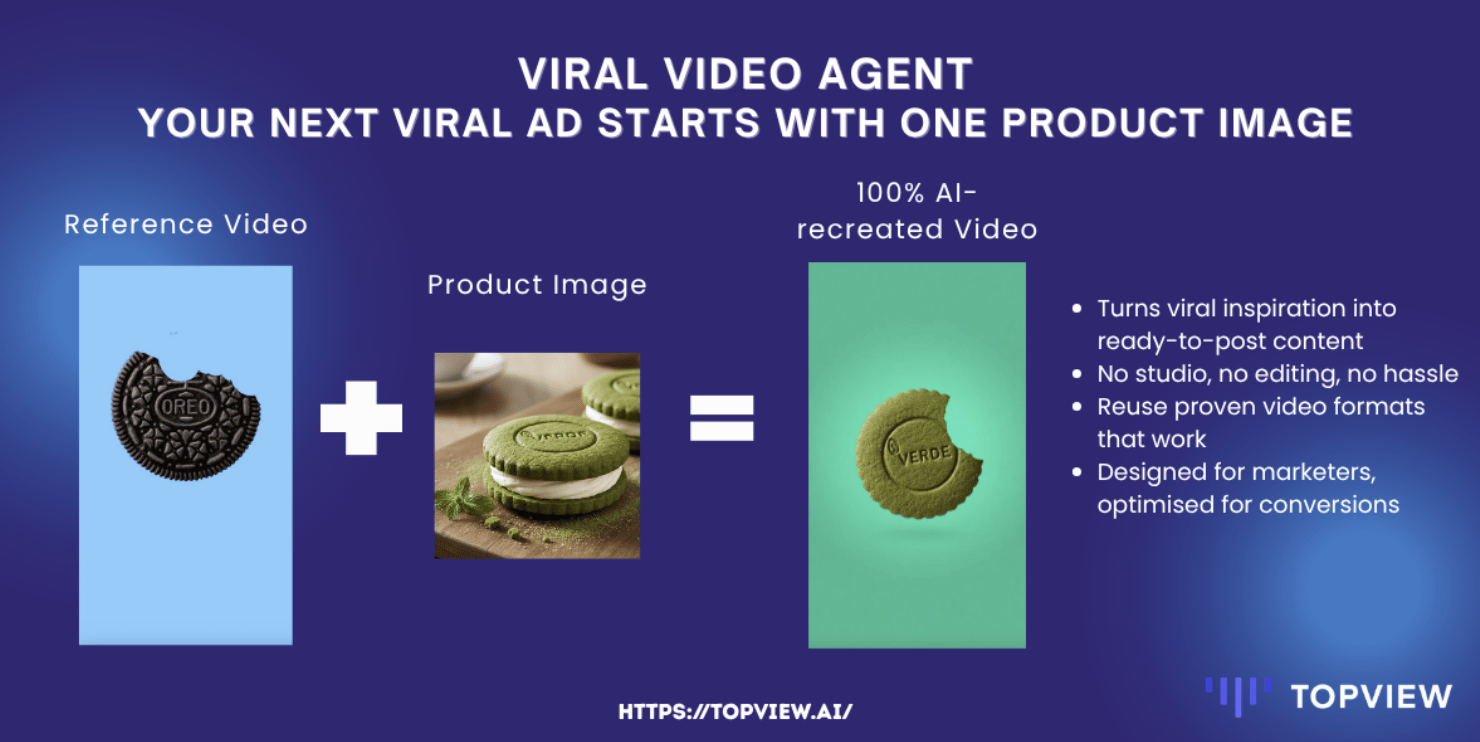 Topview AI’s Viral Video Agent, built on Sora 2, transforms a single product image into high-converting, viral-style videos.