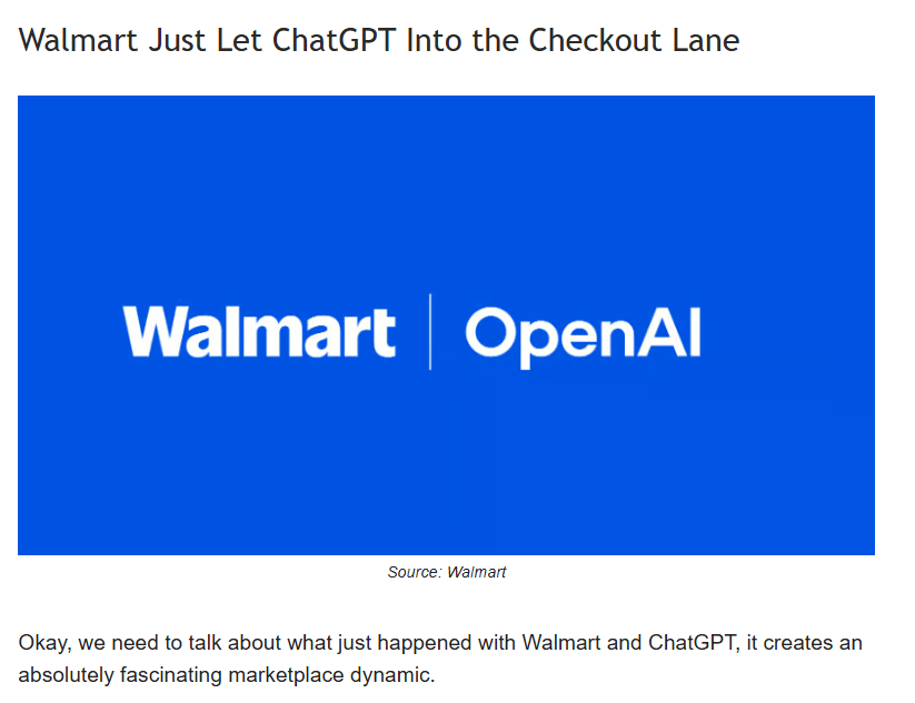 Now, if you've been following this newsletter (and bless you if you have), you already know about the other camp. Remember when I wrote about Walmart announcing in October that you can shop their entire catalog through ChatGPT? Or Etsy jumping on board? Or Shopify pledging to bring their entire merchant ecosystem along?